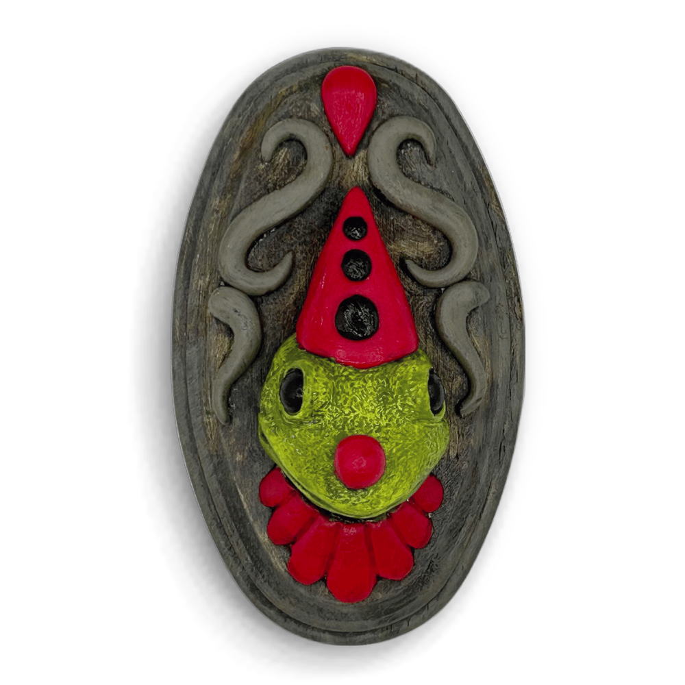 Handcrafted miniature sculpture made from hydrostone plaster, epoxy clay, wood, paint and various mixed media metals and objects. Measures 3x5" with hanging hardware on back.