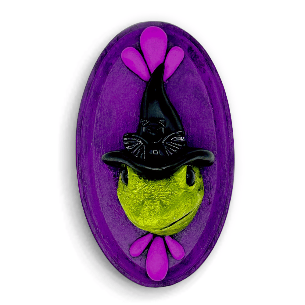 Handcrafted miniature sculpture made from hydrostone plaster, epoxy clay, wood, paint and various mixed media metals and objects. Measures 3x5" with hanging hardware on back.